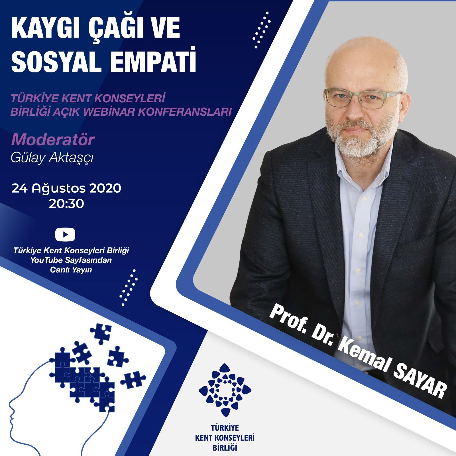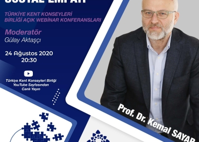 Türkiye Kent Konseyleri Birliği tarafından Pandemi sürecinde sosyal medya üzerinden herkesinkatılımına açık konferans ve eğitimler gerçekleştirilmeye devam ediyor. 24 Ağustos 2020 tarihinde Prof. Dr. Kemal SAYAR'ın katılımıyla Gülay AKTAŞÇI moderatörlüğünde "Kaygı Çağı ve Sosyal Empati" Açık Webinar Konferansı gerçekleştirildi. Türkiye Kent Konseyleri Birliği Sosyal Medya hesaplarından canlı yayınlanan konferans izleyiciler tarafından ilgiyle karşılandı.